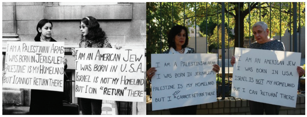 Three times in nearly four decades, Ghada Karmi (L) and Ellen Siegel (R) have stood outside an Israeli embassy, holding identical signs telling the world of their respective dispossession and privilege. London in 1973 (LHS) and 1992 and Washington, D.C. on October 25, 2011. (RHS)