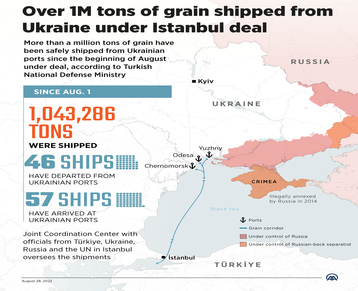 More than a million tons of grain have been safely shipped from Ukrainian ports since the beginning of August 2022 under a historic deal signed in İstanbul. SELÇUK UYSAL / AA
