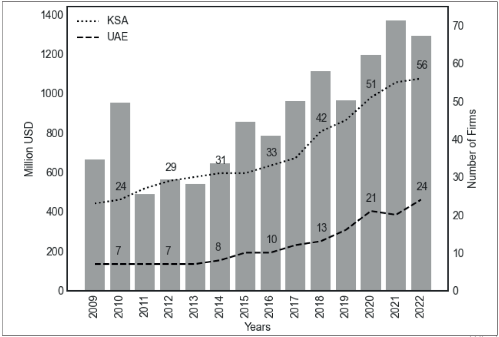 The research elucidates these arguments by analyzing Saudi Arabia and the UAE’s investments in Egypt using two distinct datasets.6 The first dataset comprises shareholder structure data from over 200 companies listed on the Egyptian Stock Exchange between 2009 and 2022. This dataset provides insights into the extent of Saudi and Emirati ownership in these listed firms, along with information on their business characteristics, including their respective sectors. Additionally, this research examined data concerning investments from Saudi Arabia and the UAE into Egypt facilitated by bilateral agreements ranging from 2000 to 2022. Essentially, this data scrutinizes state-sponsored FDI inflows from Saudi Arabia and the UAE into Egypt, analyzing established business ventures and collaborative economic projects resulting from mutual agreements between the governments of Saudi Arabia, the UAE, and Egypt. By utilizing exploratory data analysis strategies and triangulating insights derived from the analyses of these data sources, the research highlights the geo-economics bridge between the economic diversification policies of these nations and their restless economic rapprochement with the MENA region through investment flows.