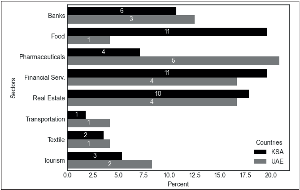 Figure 2 also reveals two key differences in the sectoral preferences of Saudi and Emirati investors in Egyptian listed companies. First, Emirati investors are more inclined to invest in the pharmaceutical and healthcare sectors than Saudi investors. As shown in Figure 3, Emirati investors have placed more emphasis on investing in the healthcare sector in recent years, accounting for a significant share of listed Egyptian companies with Emirati investment. Although Saudi investment in pharmaceuticals is actually present in four listed local firms, this sector plays a more significant role in UAE-originated investment, given the sectoral distribution of local firms attracting a prominent level of UAE investment. This may indicate that Emirati investors are more willing to invest in sectors that require a greater amount of capital devoted to research and development. This finding implies that the UAE may be different from Saudi Arabia and other GCC countries, which invest relatively less in research and development (R&D) despite the presence of large resources at their disposal.57