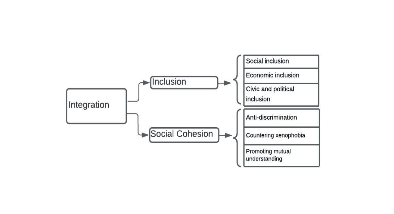 The Directorate-General for Social Cohesion of the Council of Europe defines social cohesion as one of the fundamental principles that ensure everyone has fundamental rights under equal conditions. According to the Council, social cohesion is the best concept to reject all forms of exclusion and increase social awareness on this issue. This definition is similar to the UNDP’s definition of social cohesion, which considers economic integration to be part of social cohesion.6 Furthermore, a striking recognition of social cohesion, which differs slightly from the rest, is made by the International Organization for Migration (IOM). The IOM defines integration by combining ‘inclusion’ and ‘social cohesion’ under a larger umbrella. Briefly, it accepts that both inclusion and social cohesion are integral but distinct parts of integration. The distinction between these two concepts gives us a clear lens to distinguish between economic integration and political participation (termed ‘inclusion’) and socio-relational aspects of integration on the level of acceptance and belonging (termed ‘social cohesion’). In this way, the IOM’s definition of the term social cohesion distinguishes it from previous definitions of social cohesion. According to the IOM, while integration is a multifaceted concept that addresses the social, cultural, civic, economic, and legal spheres that affect the lives of migrants, social cohesion forms only a smaller part of it by focusing on social perceptions. Therefore, social cohesion refers to the prevention of discrimination and xenophobia and the spread of a culture of tolerance.7