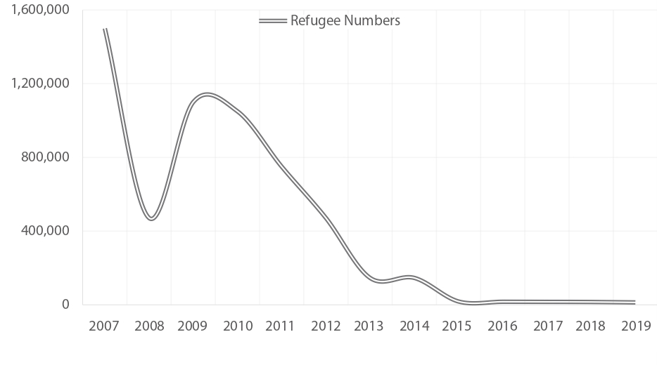 According to Graph 1, there have been huge fluctuations in the number of Iraqi refugees in Syria from 2007 to 2012. This fluctuation is one of the prominent dynamics that prevent comprehensive integration programs and create obstacles for policymakers. According to the UNHCR, the number of refugees returning to Iraq was about 45,000 in October 2007. The average number of refugees returning to Iraq was 1,500 in 2007, whereas the number of refugees migrating to Syria was around 500 per day. This rate changed in the following years. Some refugees who migrated to Syria believed that the security situation in Iraq had improved, and they wanted to return to Iraq to reunite with their families. In addition, the Syrian government enforced some restrictions on refugees in the following period, and in the meantime, the Iraqi government said that they would provide free onward transportation assistance to refugees who wish to return home.58