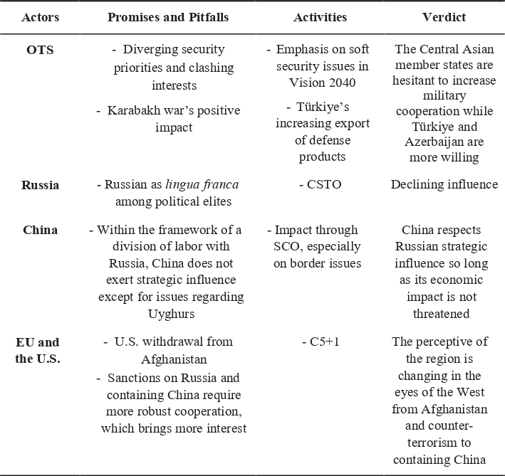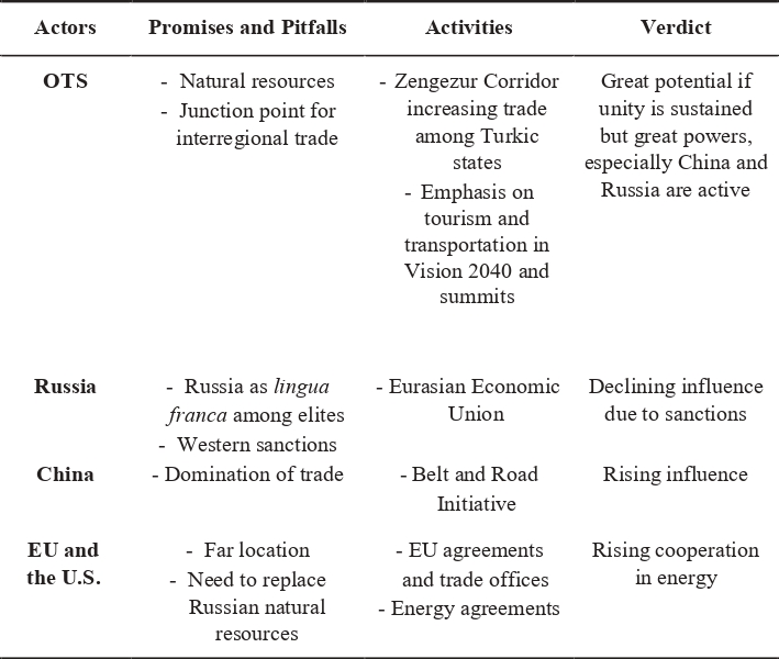 In summary, the OTS is designed to serve as a unifying force, empowering Turkic states to collectively navigate the complex security environment in Central Asia, the Caucasus, and beyond. The theoretical framework used in this work recognizes the OTS as such an actor in this arena, where the collective strength and influence of the Organization play a role in shaping regional dynamics in multiple structures. Thus, the theoretical framework deployed in the analysis of the OTS within the international context spotlights the intricate interplay between economic, strategic, and soft power activities, all of which constitute essential facets of the OTS’ engagement with the international and regional systems. A comprehensive understanding of these dynamics is paramount to appreciate the Organization’s position and impact in the intricate geopolitical landscape of Central Asia and the Caucasus.