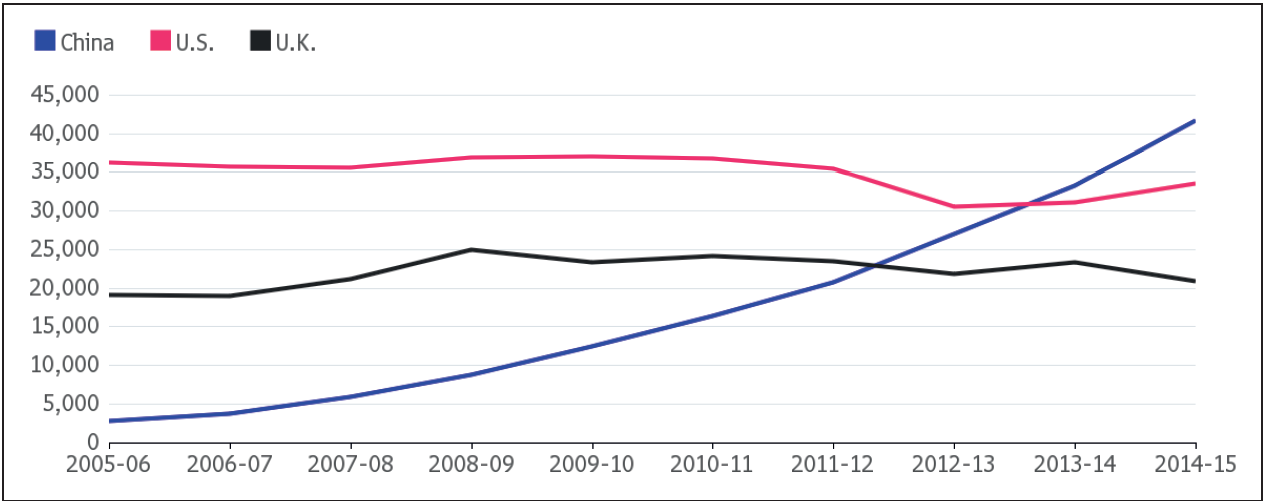 Graph 4: The Number of African Students Studying in China, the U.S., and the UK (2005-2015)