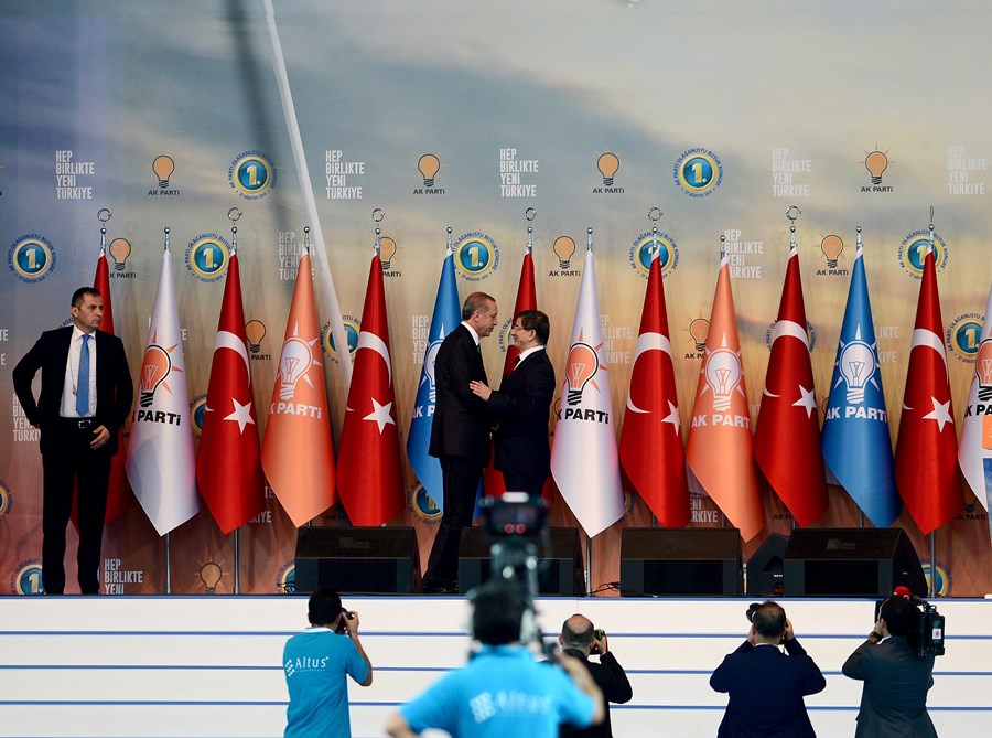 President elect, Recep Tayyip Erdoğan, congratulating the new leader of the AK Party, Ahmet Davutoğlu, after the first Extraordinary Congress on August 27, 2015. | AA PHOTO / VOLKAN FURUNCU