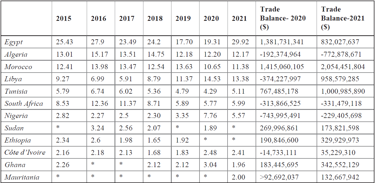 Table 1: Top Ten Trading Partners of Türkiye in Africa (%, 2015-2021)