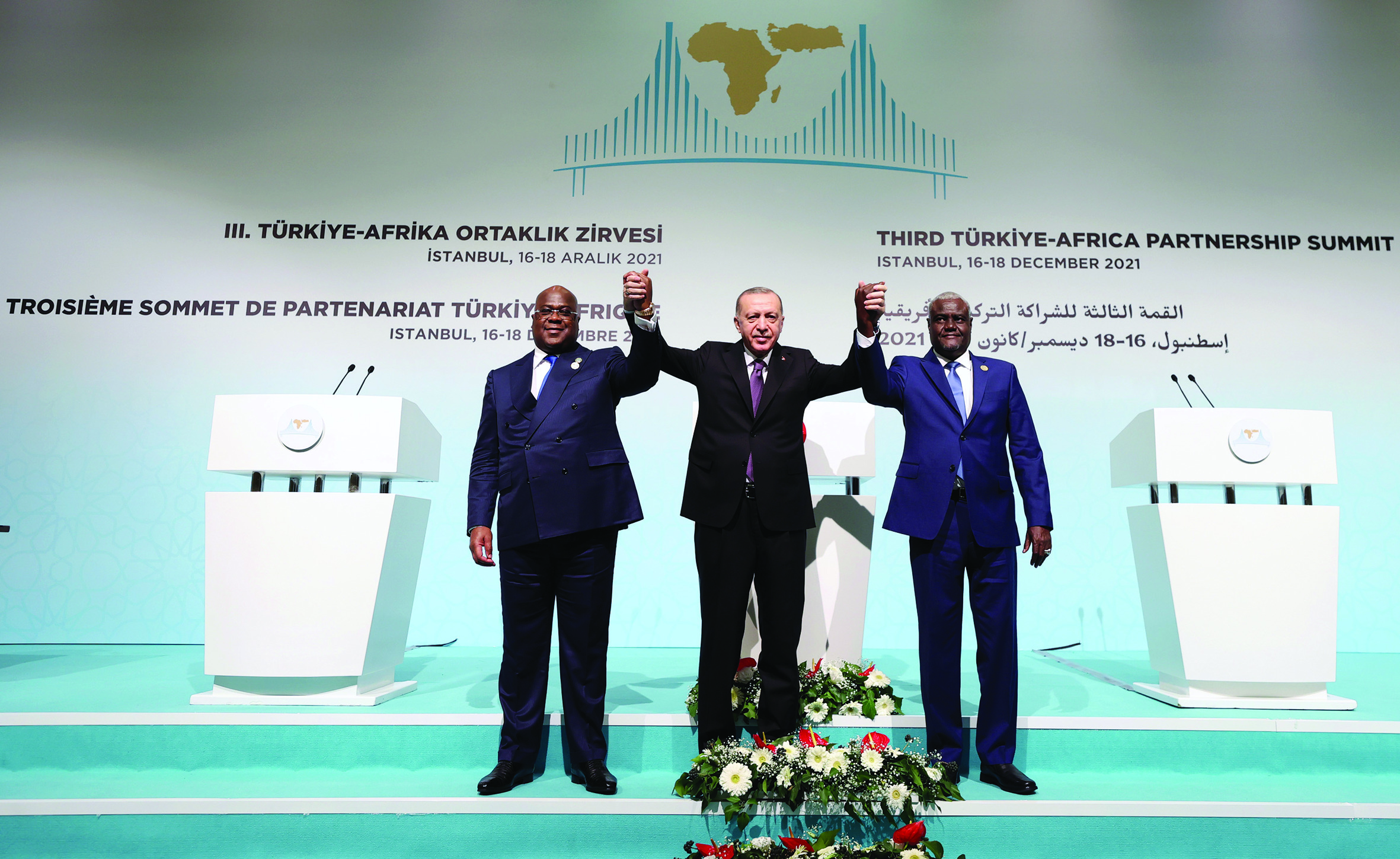 Turkish President Recep Tayyip Erdoğan (C), Democratic Republic of the Congo President Felix Tshisekedi (L) and African Union Commission President Moussa Faki Mahamat (R) met within the scope of the 3rd Türkiye-Africa Partnership Summit held in İstanbul on December 18, 2021. MURAT KULA / AA
