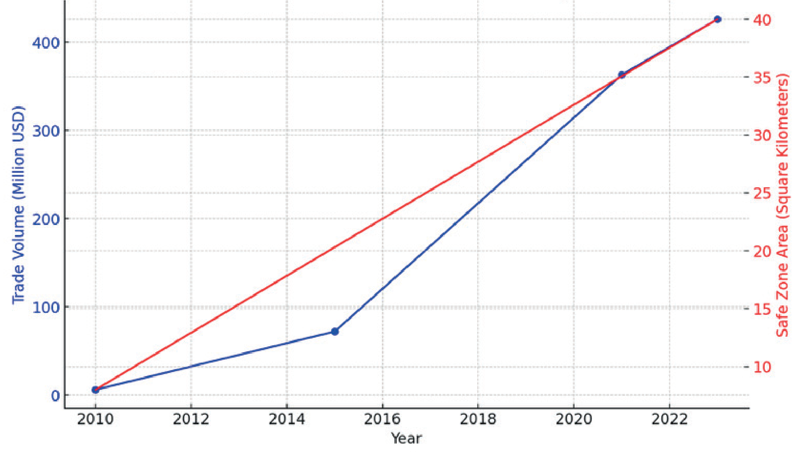 Graph 1: Somalia Safe Zone Area and Trade Volume Relations (2010-2023)