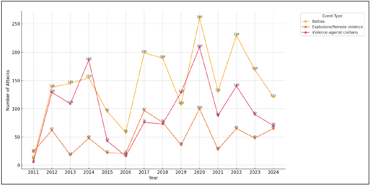 Graph 5: Number of Attacks in Western Africa by Event Type (2011-2024)