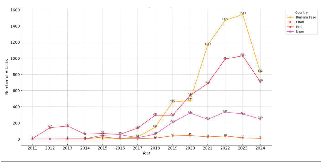 Graph 6: Number of Attacks in Sahel Belt by Country (2011-2024)